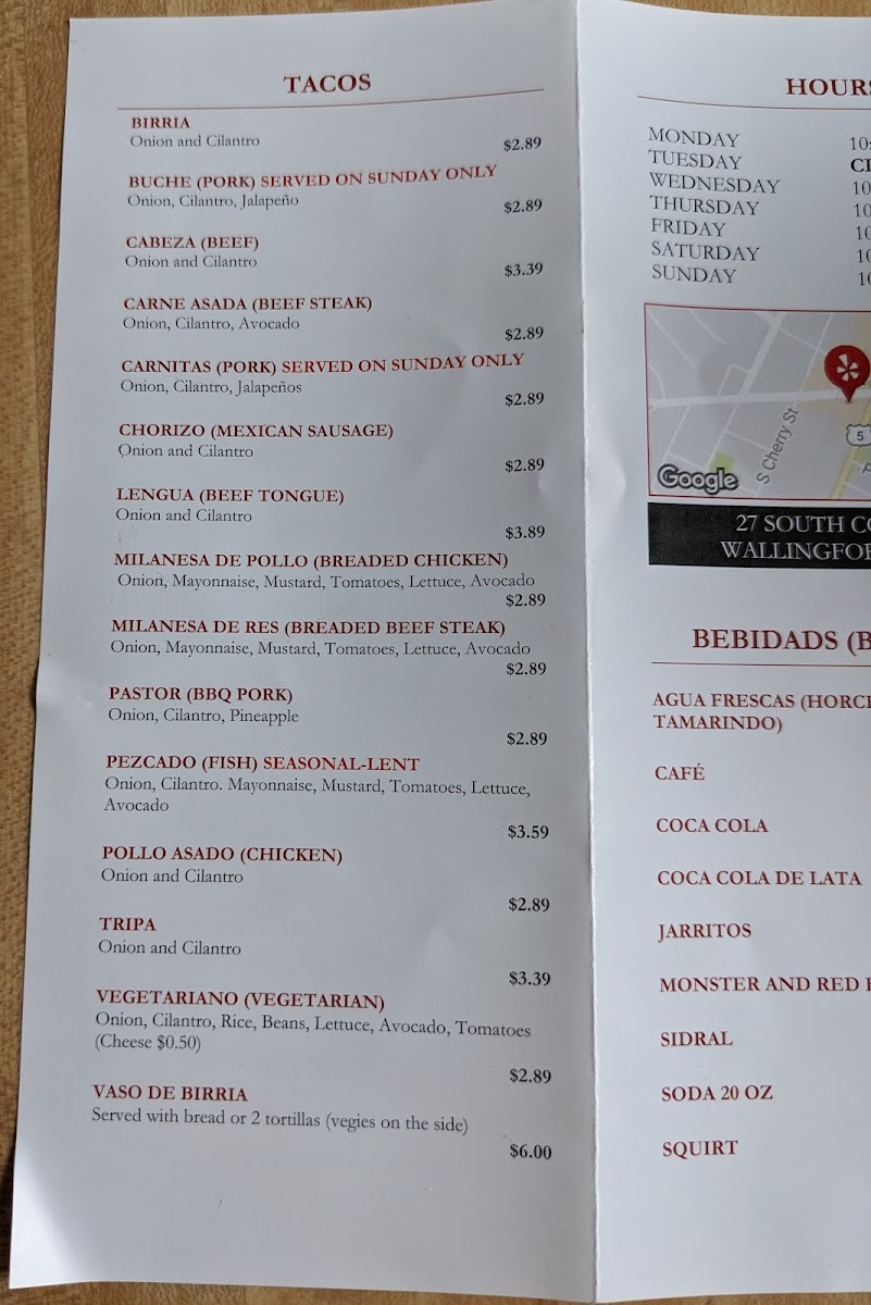 The menu at Rivas Taqueria features a range of traditional Mexican dishes, organized into several main categories. Visitors can find Especialidades such as Birria, Pollo Asado, Menudo, and Pozole, offering hearty options that reflect authentic Mexican flavors.