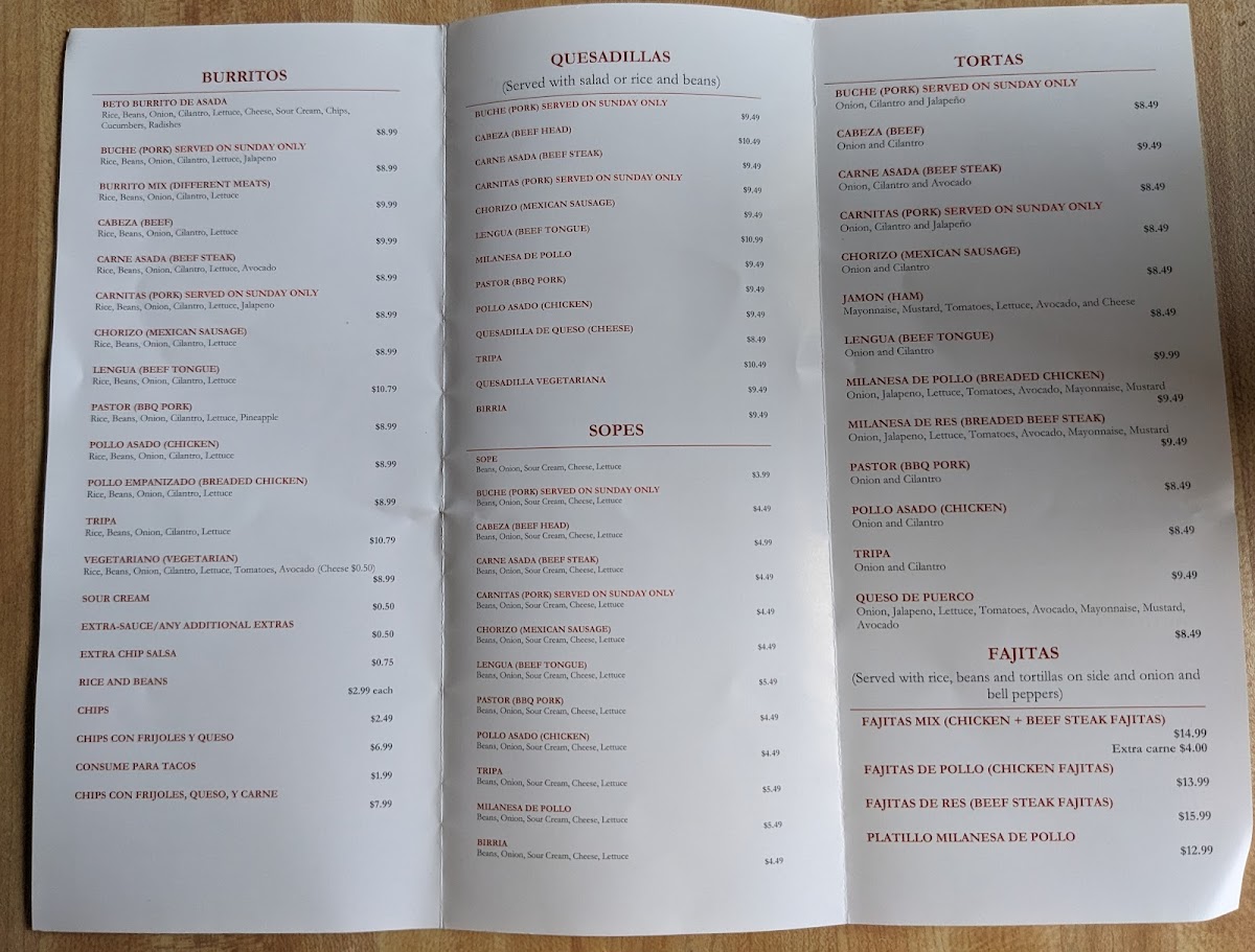 This menu is suitable for casual dining occasions, ranging from light meals and snacks to more filling options. The variety of tacos, burritos, tortas, and specialties accommodates customers seeking both quick orders and more leisurely meals.